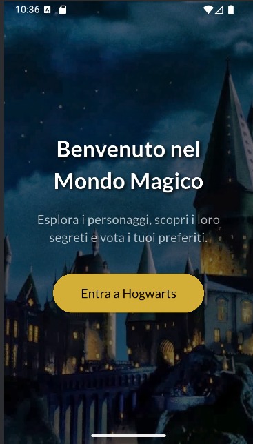 “Entra nel magico mondo”: con questa frase si apre l’app Android da me realizzata in Flutter, dedicata all’universo di Harry Potter e creata come progetto d’esame. Fin dalla prima schermata, il castello di Hogwarts sullo sfondo accoglie l’utente in un’atmosfera incantata, pronta a essere esplorata con un semplice tocco.