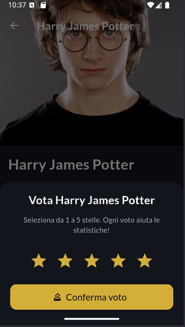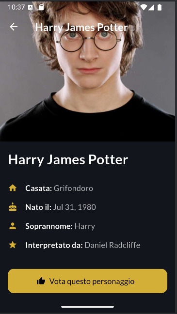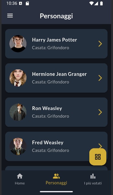 In questa schermata, l’utente può esplorare i personaggi principali della saga di Harry Potter, visualizzati tramite una chiamata API. Ogni personaggio viene mostrato con un’anteprima che include: